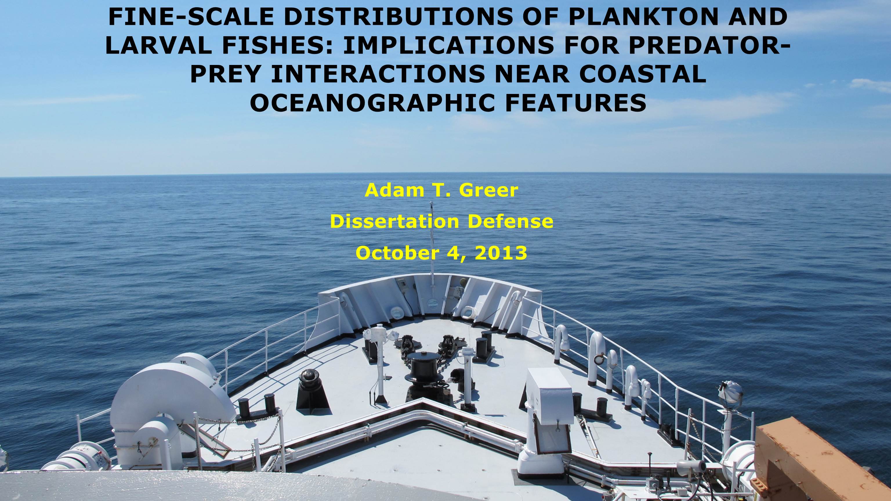 A big congratulations to Dr. Adam Greer, who defended his dissertation on Friday. The title of his dissertation is, “Fine-scale distributions of plankton and larval fishes: Implications for predator-prey interactions near coastal oceanographic features”