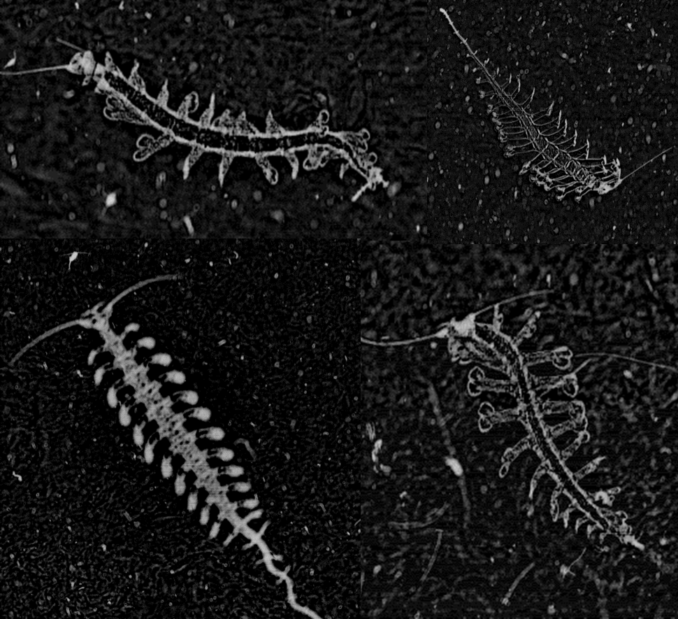Many of these polychaetes (Tomopteris spp.) are actively swimming. The gut runs down the center of the animal between the legs, but it is difficult to see in these images.