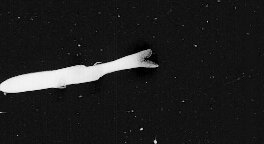 Yet another really neat capture of the ribbon-like Cestid Ctenophore. Although it may not appear like the cydippid ctenophore above, they both share many characteristics. You can see here the comb rows along the top (oral) side of the organism, on the right side of the guy captured in this frame. Like the cydippid ctenophores, these comb rows are used for both locomotion and foraging. The stomodaeum, or oral canal is also visible here, seen as the apparent crease along the oral-aboral axis in the mid-section of the organism. When it comes to locomotion, the Cestid ctenophores have a trick up their sleeve, able to move through the water column via undulation of their body. This is what we are witnessing in this capture here. Either that or this guy is dancing for the ISIIS camera.