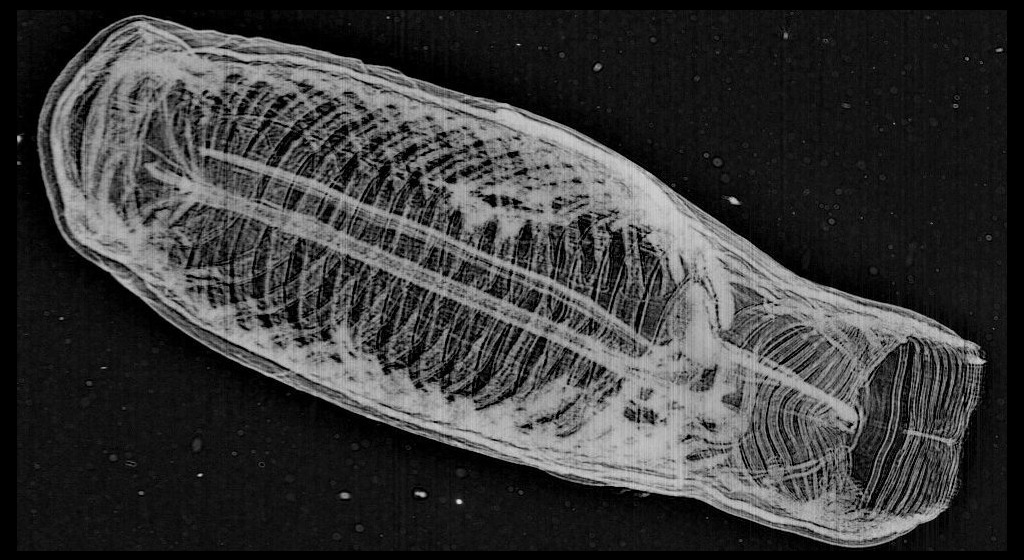 Another really great find of one of the rarest organisms in this data set—fish larva, or ichthyoplankton! The taxonomic ID for this guy is either an Engraulid (anchovy) or a Clupeid (sardine). This one here is quite big, and is a post-flexion larval fish. Larval fish pass through three substages, if they are lucky enough to survive during this extremely vulnerable period: preflexion, flexion, and postflexion. These stages are in reference to the orientation and flexibility of the notochord, the rigid axial support that predates the formation of the vertebral column developmentally in chordate species. Pre-flexion larval fish have a notochord that is incapable of movement required for locomotion and foraging. Larval fish in this preliminary substage rely on a yolk sack provided for them in their early ontogeny. Flexion, or the development of flexibility of the notochord occurs at roughly the same time the yolk sack is depleted. This is a ‘critical period’ where the larval fish must find food within a short period of time, or the ichthyoplankton will not survive! Thus, the temporal and spatial distribution of ichthyoplankton in the water column is a crucial determinant of their survival. This guy is very lucky for having survived to this stage! Let’s all give him a round of applause.